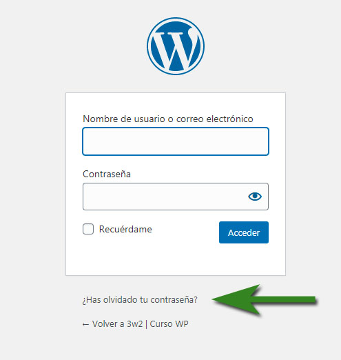 Para empezar el proceso accedemos a la página de acceso a WordPress y clicamos en el enlace que nos dice "¿Has olvidado tu contraseña?" como puedes ver en el siguiente gráfico.