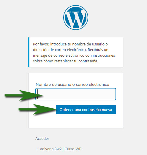 Una vez clicas en el enlace accedes a una página muy similar donde te piden el correo electrónico de tu perfil de administrador o tu nombre de usuario. Introduce los datos y clica en "Obtener una contraseña nueva ". El sistema enviará instrucciones para que accedas a una página donde podrás cambiar la clave de acceso.