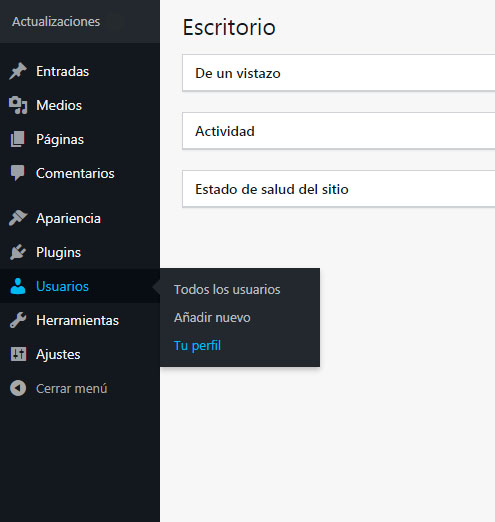 Para cambiar los datos de acceso desde el interior de nuestro WordPress accedemos al menú lateral en la zona de administración y clicamos en Usuarios > Tu perfil como puedes observar en el siguiente gráfico.