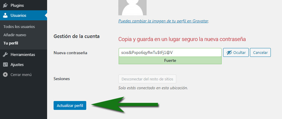 Asegúrate de copiar y guardar la nueva contraseña en un lugar seguro y clica en Actualizar perfi para terminar el proceso. Tu contraseña estará cambiada y el próximo acceso lo tendrás que realizar con los nuevos datos.